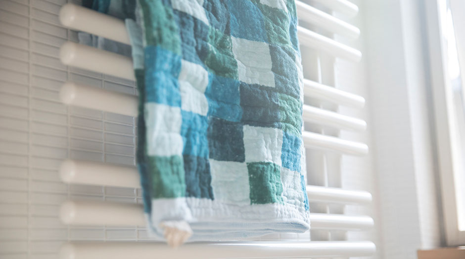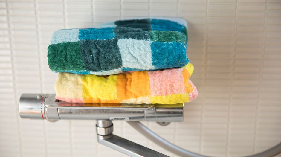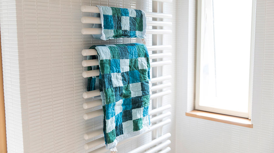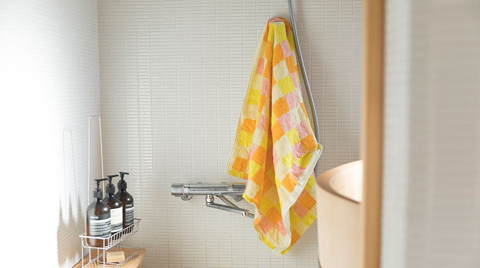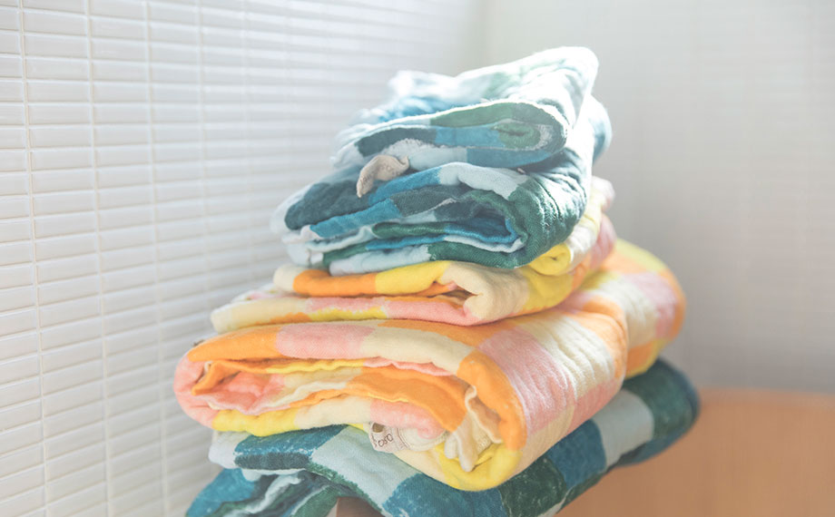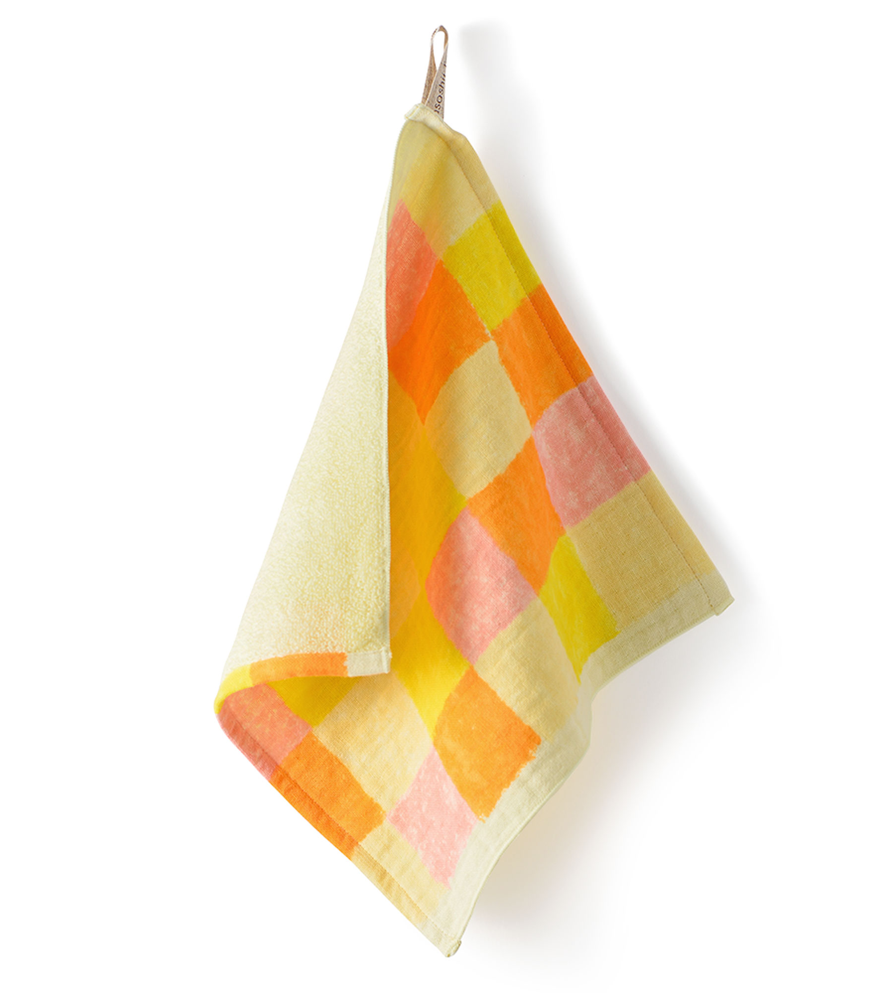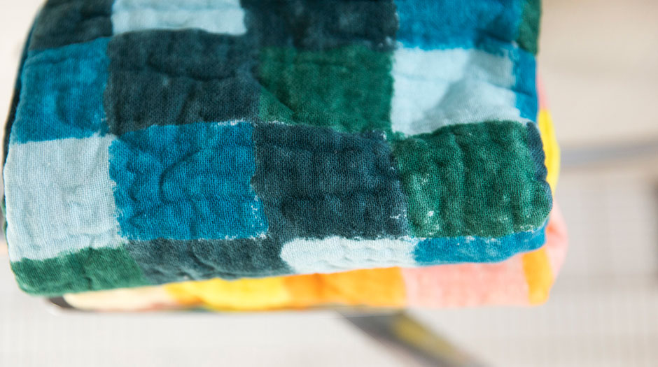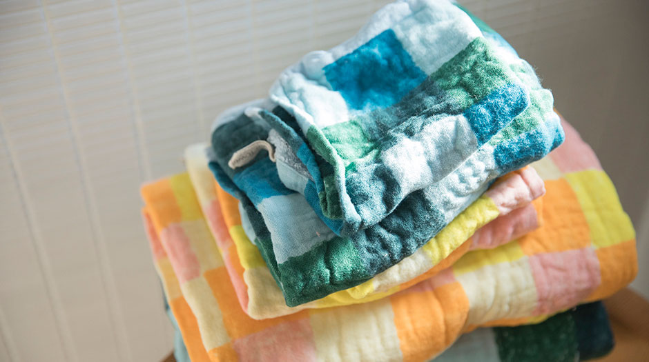 黄色を基調とした『太陽』と、 青・緑を基調にした『森』。 プリントでチェックを表現した 2色のタオルです。 ヨーロッパの石畳、あるいは 飛行機から見えるうつくしい遠景の大地のよう。 白で織ったタオルを製品染めしたあと、 パステルで手描きしたブロックチェックを ガーゼ面いっぱいにプリントしました。 北欧で使われる毛布や インテリア・ファブリックのような やわらかい印象があります。 サイズはハンド・フェイス・バスの3種類です。