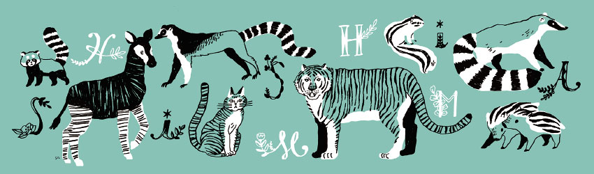からだにシマ模様のあるどうぶつたちがならびます。
