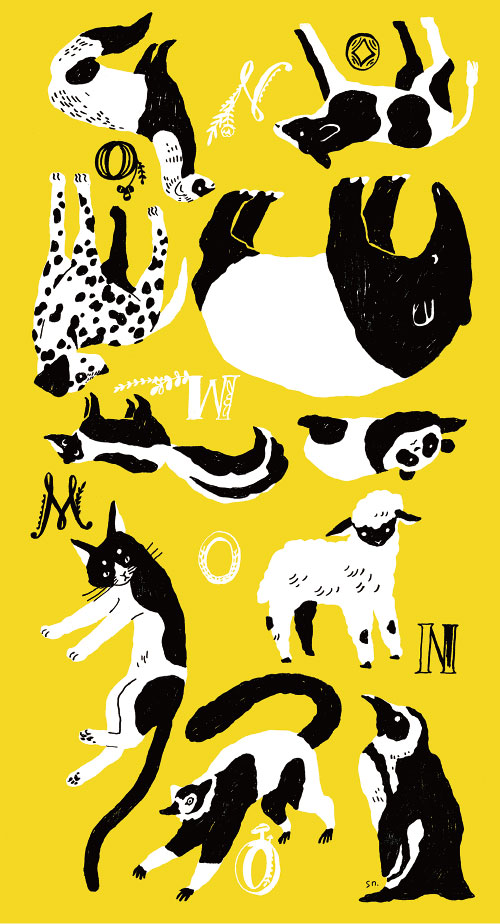 黄色の地色に、白と黒の身体をもつどうぶつたち。