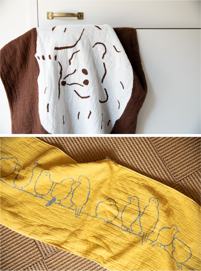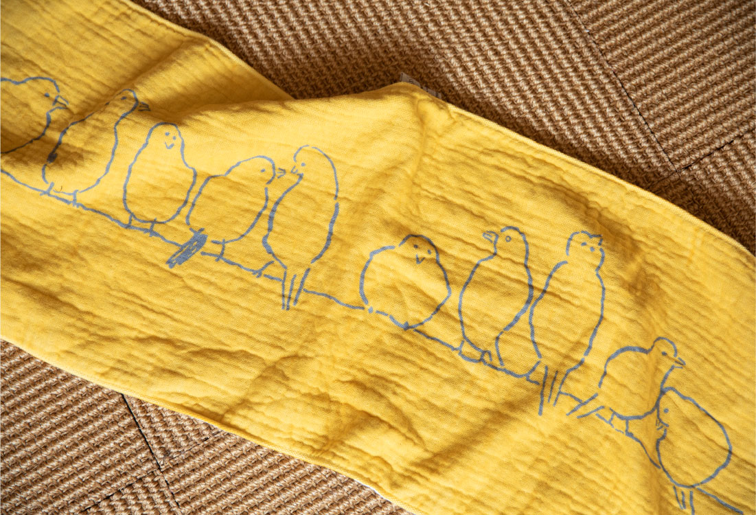 フェイス=ことり(からし色のベースにグレーの線画)、