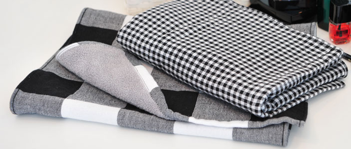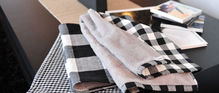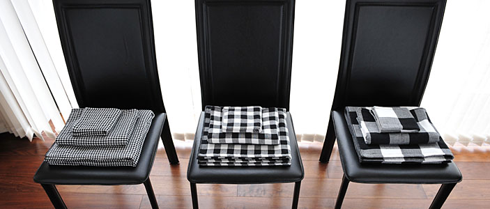 チェックのいろいろな種類の中で、 もっともシンプルといわれるギンガムチェックを、 黒と白のモノクロの配色で織り上げました。 チェックの大きさに3つのバリエーションをつけたことで、 親しみのあるかわいいギンガム、スマートなギンガム、 大胆でモダンなギンガムができました。