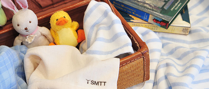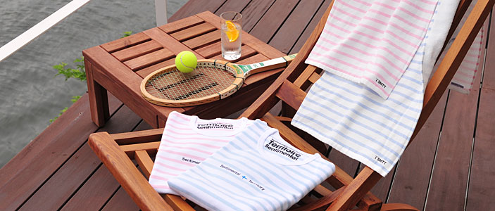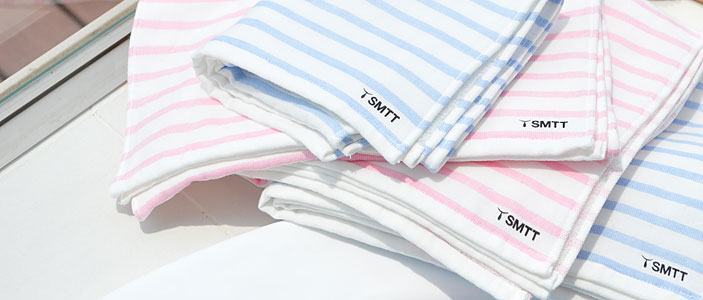 「SMTT(センチメンタルテリトリー)」の ボーダーシャツを「やさしいタオル」にしてみたら、 こんなにかわいいタオルになりました。 パステルカラーのさわやかなブルーと、 甘くなりすぎない淡いピンク、そして、生成り色です。