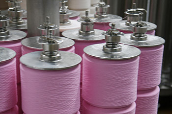 ▲捺染の機械から染めたばかりのタオルを取り出すときは、
