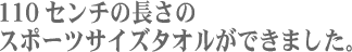| いままでのハンド、フェイス、バスのシリーズとは別に、 「スポーツサイズ」のタオルを作りました。 ジムで使ったり、首にまいたりする他にも、 バスタオルをもっていくほどではないかな、という ピクニックや、日帰り旅行の時にとても重宝です。