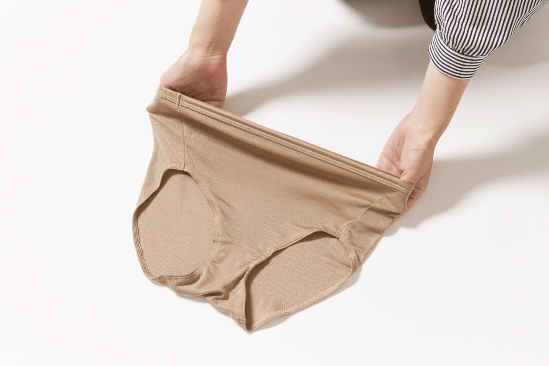 ウエストや足ぐりはやわらかいゴムをシルクでくるんで、