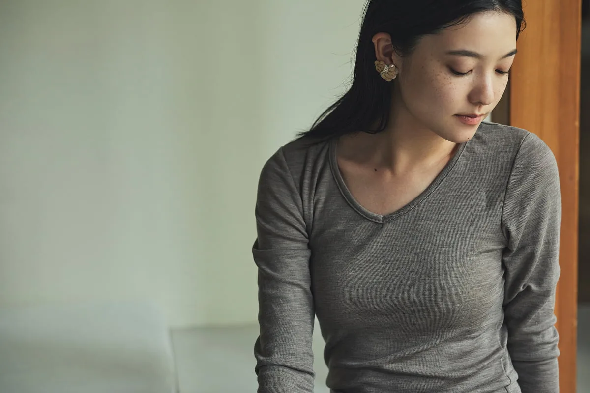 佐久間 EMMA以外のメリノウール100%は、 ほっこりした感じのあたたかさがあり、 ふっくらとした編み地で包まれる感じがします。 EMMAは細いリブ編みになっていて、 薄手のサラッとした着心地です。 襟ぐりの開きが深いので、 鎖骨を見せるようなファッションでも インナーとして着やすいかなと思います。