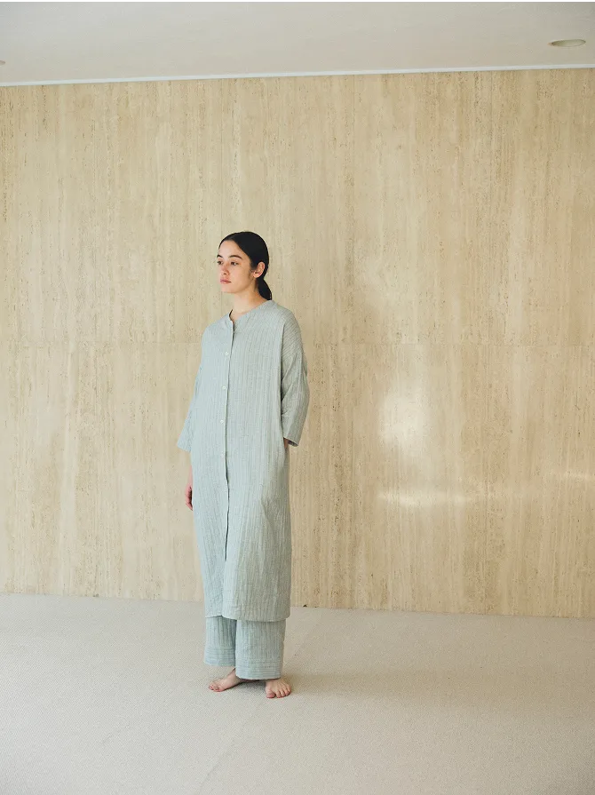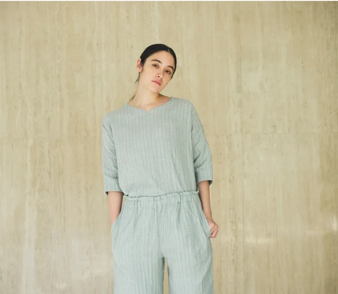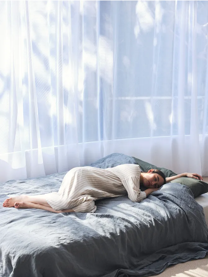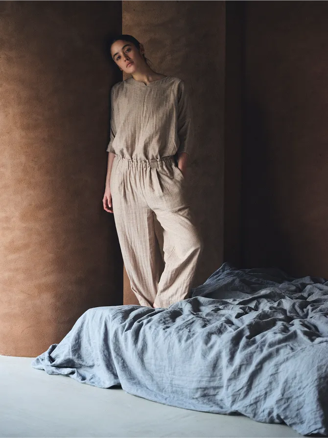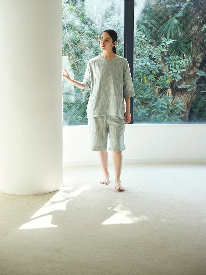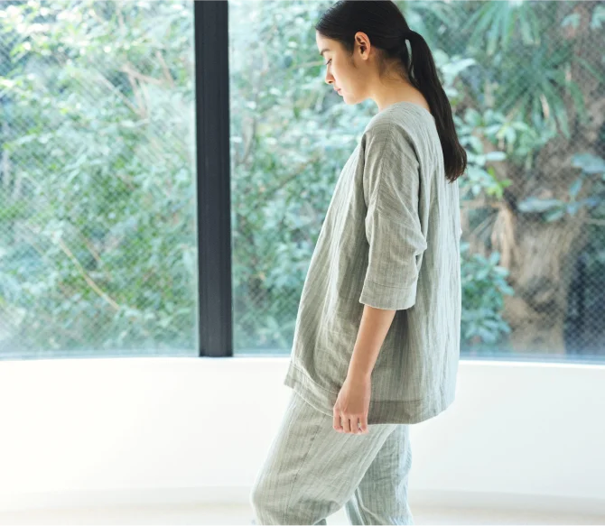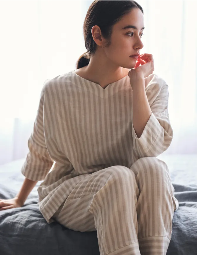 眠る時間を大切にしているという、 スタイリストの轟木節子さん。 心地よい眠りの時間のために、 パジャマは大事なアイテム。 創業60年以上のパジャマメーカーが手がけるブランド・ 快眠ラボが開発した「雲ごこちガーゼ」に すっかり魅了されていると話します。 つきのみせとのトリプルコラボアイテムが、 ひさしぶりにできあがりました。 月夜にあう落ち着いた色味の、 着ているだけでうれしくなるナイトウェアです。 まずは大きな写真でどうぞ。