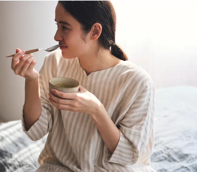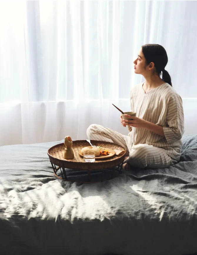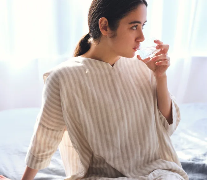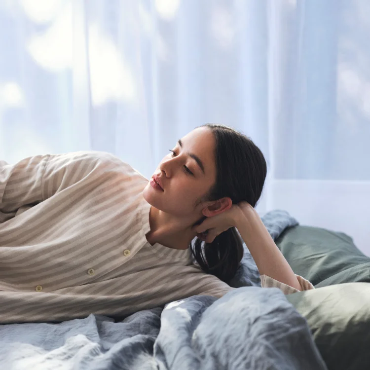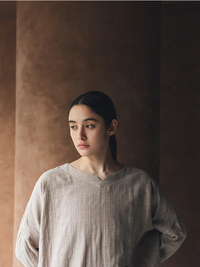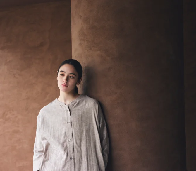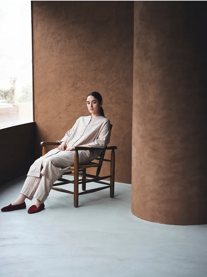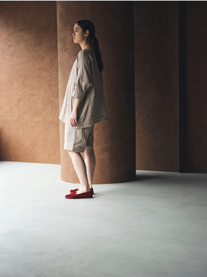 眠る時間を大切にしているという、 スタイリストの轟木節子さん。 心地よい眠りの時間のために、 パジャマは大事なアイテム。 創業60年以上のパジャマメーカーが手がけるブランド・ 快眠ラボが開発した「雲ごこちガーゼ」に すっかり魅了されていると話します。 つきのみせとのトリプルコラボアイテムが、 ひさしぶりにできあがりました。 月夜にあう落ち着いた色味の、 着ているだけでうれしくなるナイトウェアです。 まずは大きな写真でどうぞ。