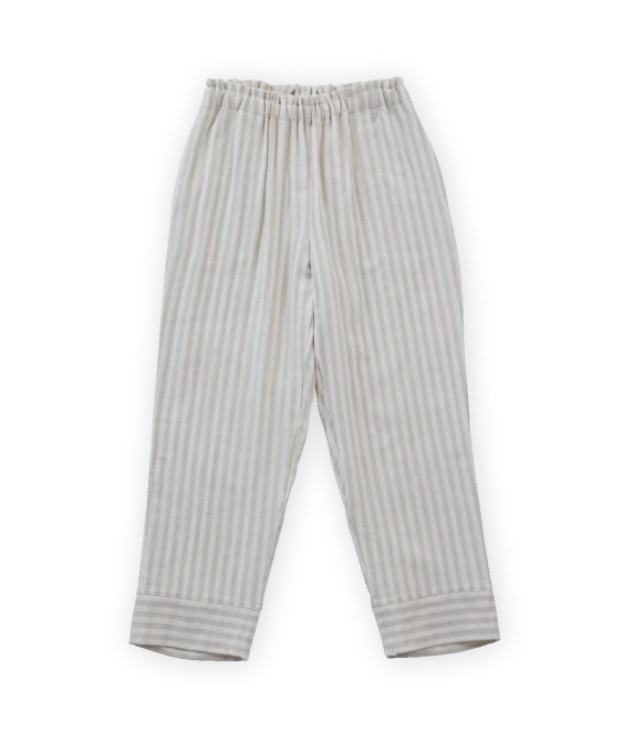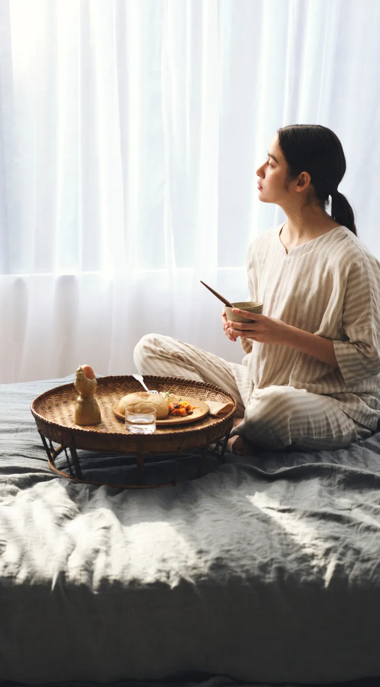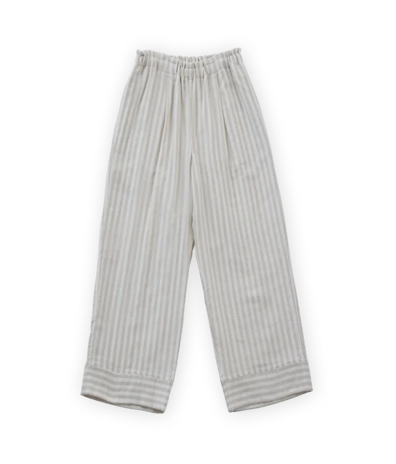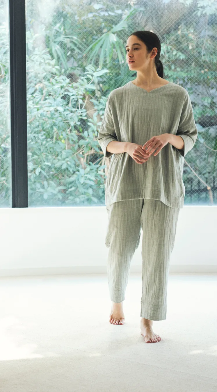 ふんわり、やわらかい生地は 熟睡したい夜の時間にぴったり。 轟木さんのデザインによって、 着ているだけで気分があがる とびきり素敵なパジャマになりました。 寝ているうちに一日の疲れを癒やしてくれるような、 光をまとった色も身につけるだけでうっとり。 はやく着替えてベッドに飛び込みたくなる、 とっておきのリラックスウェアです。