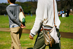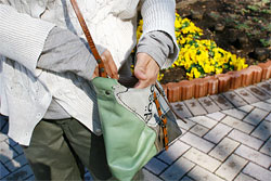 このバッグのデザインの特徴である、 いろんな色の革の組み合わせは、 おふたりが、 「革だからといってハードになりすぎないように」 と心がけて、きれいな配色をえらんでいます。 白いTシャツや無地系の、 ちょっと抑え気味の洋服を着た人が このバッグを持っていたら、アクセントになって かなりおしゃれなのではないでしょうか。 実際、「木曽ツインズ」のおふたり自身も、 無地の洋服を着て、 このバッグをアクセントにしていることが 多いそうですよ!