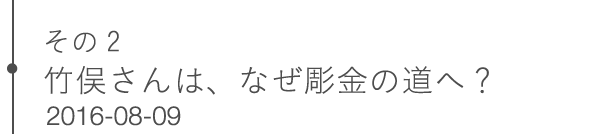1975年金沢生まれ。95年に彫金を学びはじめ、アクセサリーショップを経て2002年に独立、オーダージュエリー中心に活動を始める。2004年、アトリエ兼ショップ「KiKU」オープン、2007年には生活動具の製作も開始。2011年、金沢東山に2店舗目となるアトリエ兼ショップ「sayuu」オープン そこを拠点にしながら、全国での展覧会も積極的に開催している。フルオーダーメイドのウェディングリングは、 シンプルで品があり、ながく飽きないデザインで高い人気がある。 金沢では、「ふたりでつくるマリッジリング教室」なども開催している。 竹俣さんのウエブサイトはこちら。