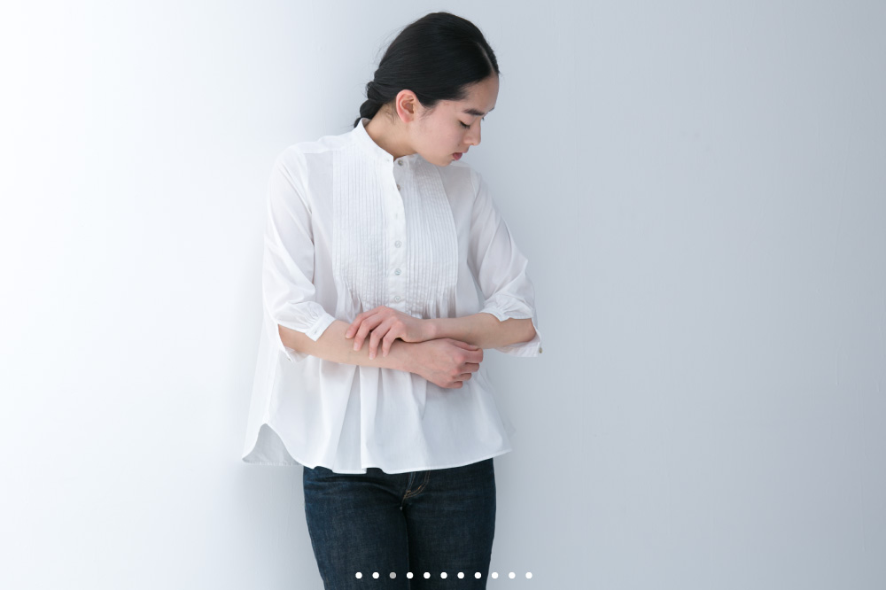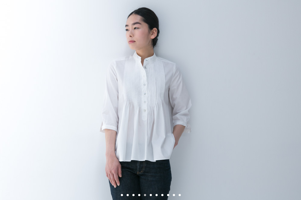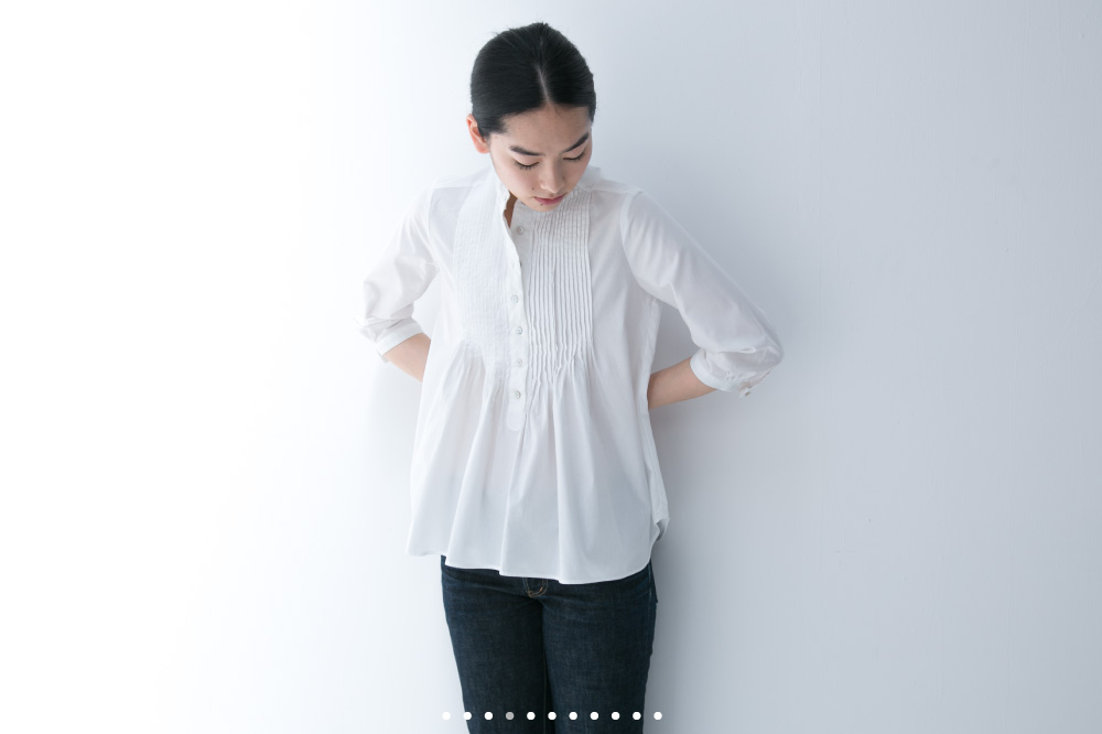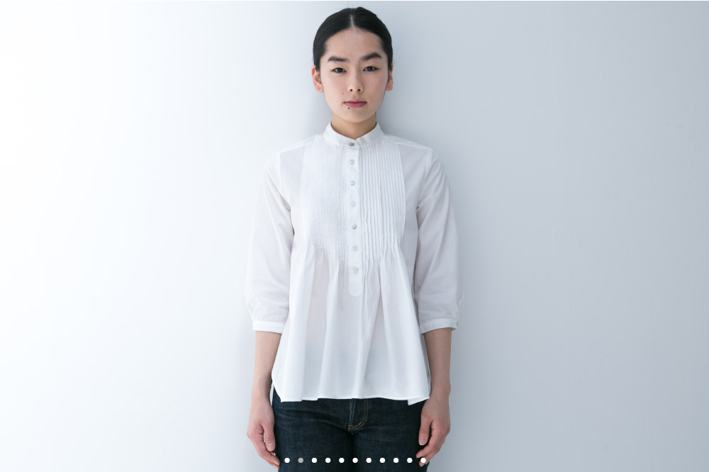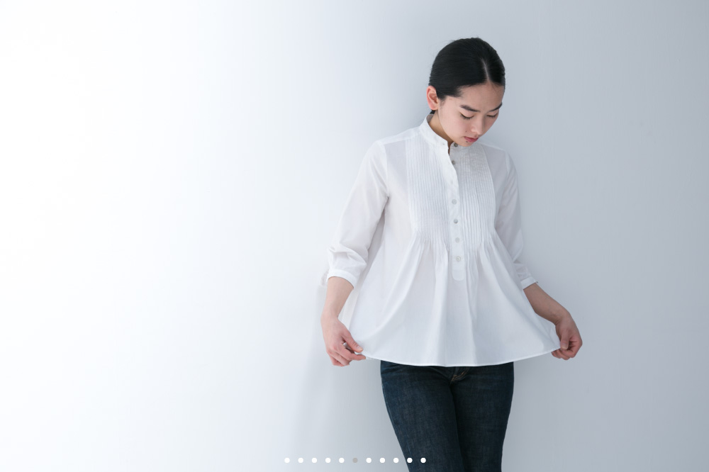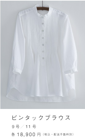 このブラウスは、 なにより胸元にたくさん寄ったピンタックがポイントです。 そして、ピンタックの縫いどまりから ほどよくふわりと広がるシルエットが、 なんともかわいらしい。 その「ふわり」を活かすために、 他のものにくらべるとサイズはちょっと小さめ。 肩幅や身頃など、からだにぴったりさせて、 「ふわり」を強調させています。 ボタンをすべてとめて、きちんと着るのもいいし、 袖口や胸元のボタンを開けて、ラフに着こなしても。 ボタンのかけ方ひとつで、表情が変わるので、 それに合わせていろいろな着こなしを楽しんでください。