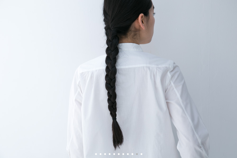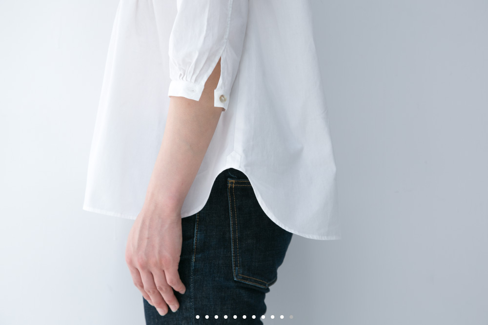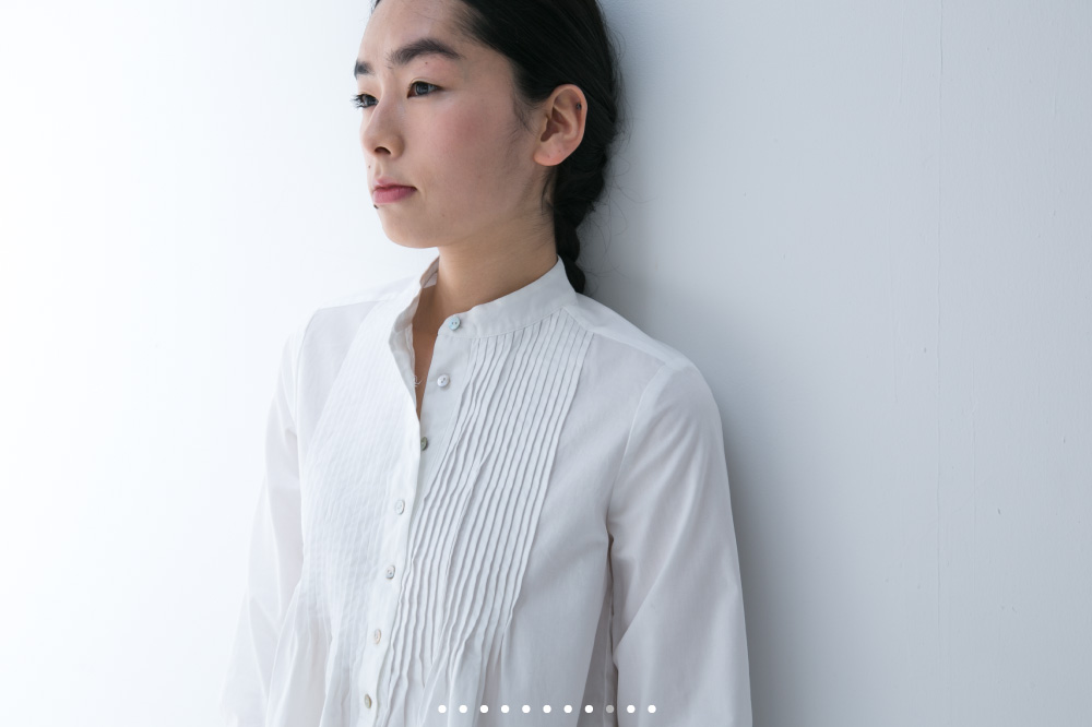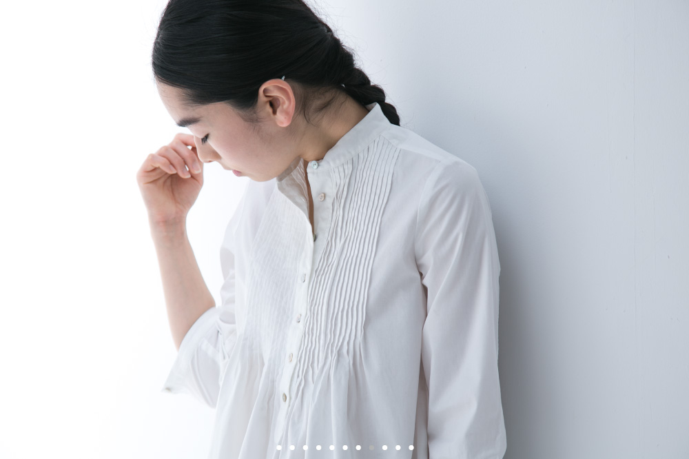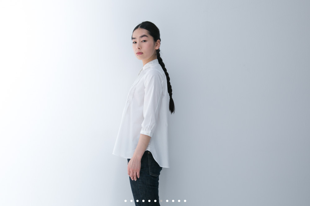 このブラウスは、 なにより胸元にたくさん寄ったピンタックがポイントです。 そして、ピンタックの縫いどまりから ほどよくふわりと広がるシルエットが、 なんともかわいらしい。 その「ふわり」を活かすために、 他のものにくらべるとサイズはちょっと小さめ。 肩幅や身頃など、からだにぴったりさせて、 「ふわり」を強調させています。 ボタンをすべてとめて、きちんと着るのもいいし、 袖口や胸元のボタンを開けて、ラフに着こなしても。 ボタンのかけ方ひとつで、表情が変わるので、 それに合わせていろいろな着こなしを楽しんでください。