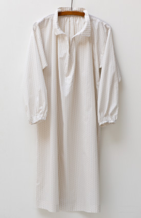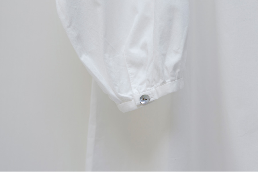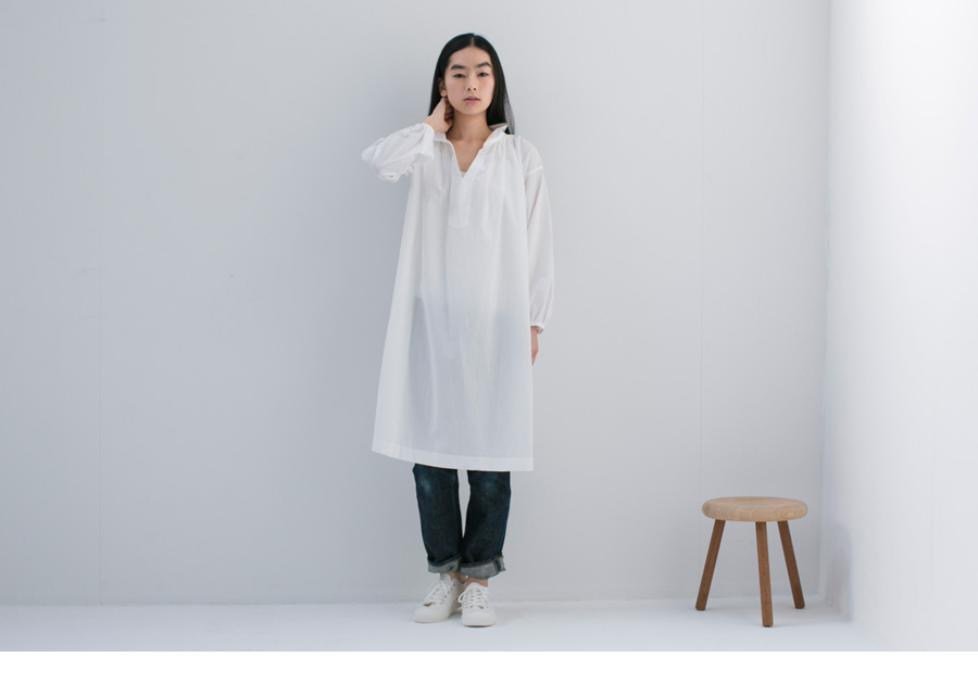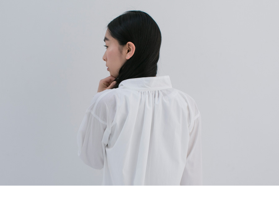 襟つきですが、ボタンがないので、 着ているときも、 また脱いだり着たりするのもとてもらくちん。 また、後ろ身頃にとったギャザーや 襟の丸みなどもポイント。 家にいるときや、お買い物に行くときなど、 ふつうでありながらも、 おしゃれ心を忘れたくないものです。 Tシャツやキャミソール、レギンスやデニムなど コーディネートするものはなんでも。 真夏は一枚でさらりと着ても様になります。 ビーチサンダルやまっ白スニーカーと一緒にどうぞ。