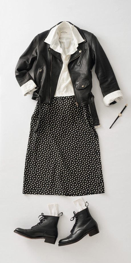 裾は黒地に白いドット柄のスカートにイン。