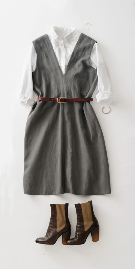 すとんとしたグレーのジャンパースカートを、