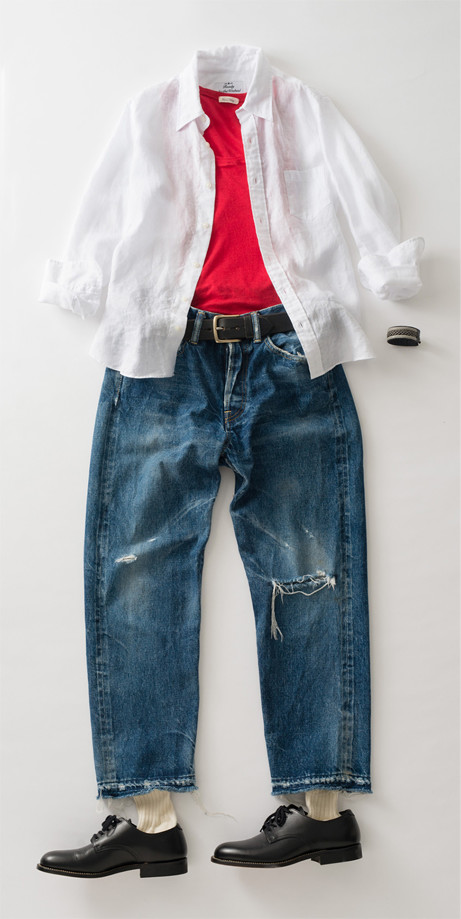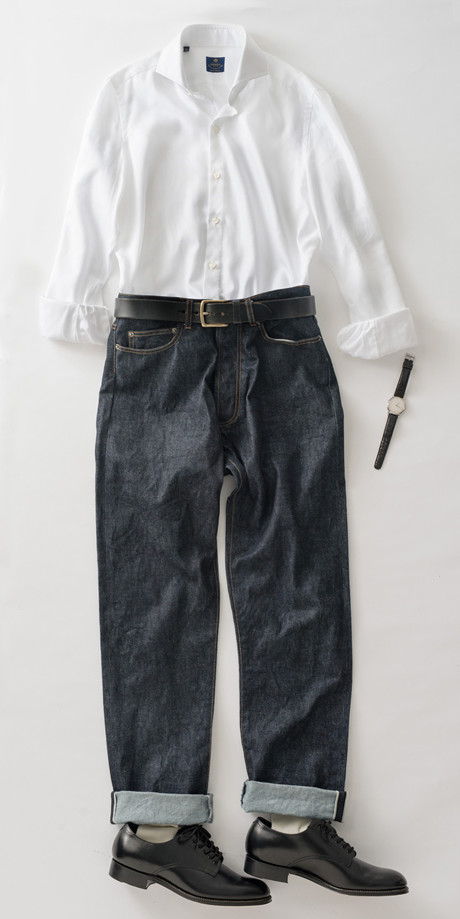 デニム、革ベルト、革靴、リストウオッチ、