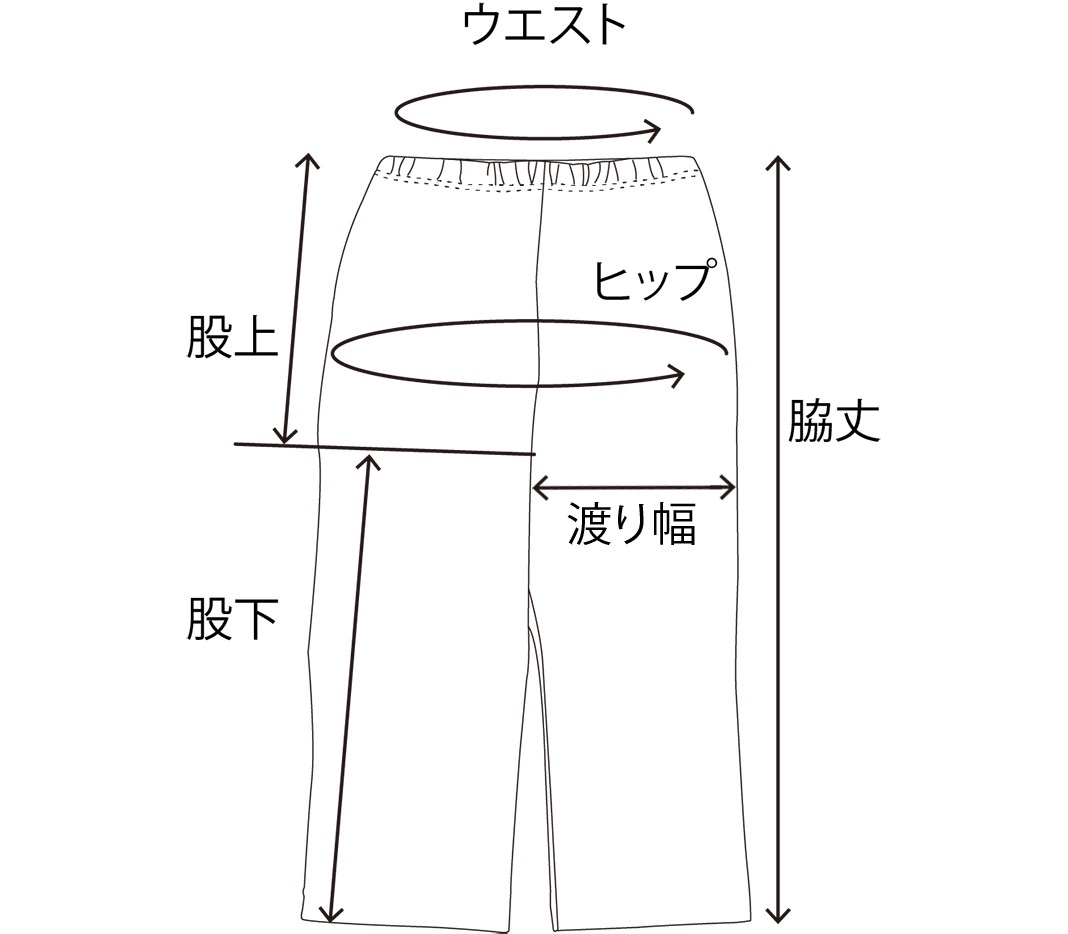 | サイズ | 脇丈 | ウエスト | ヒップ | 股上 | 股下 | 重さ |