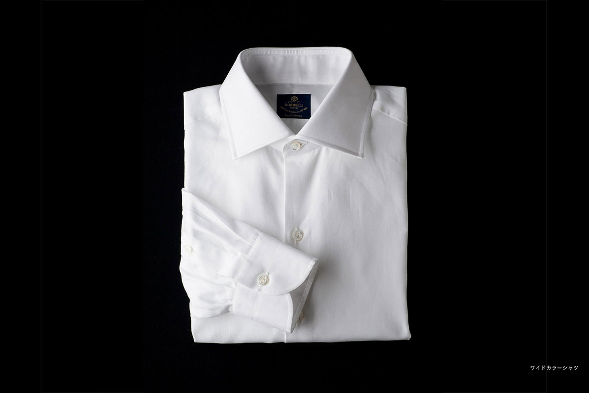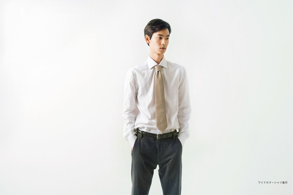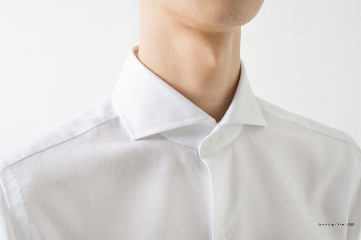 このワイドカラーシャツの素材は「ヘリンボーン」(杉綾)。