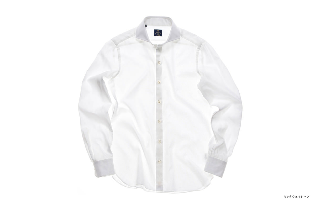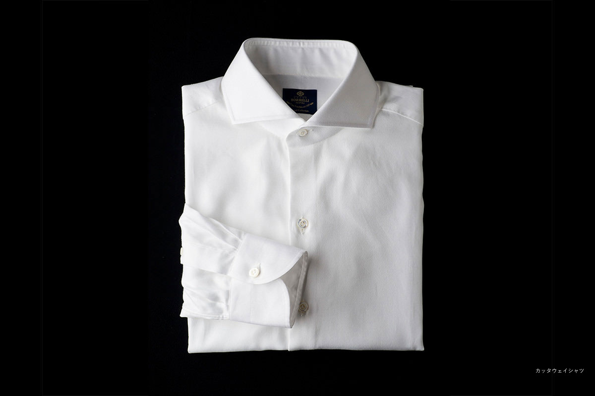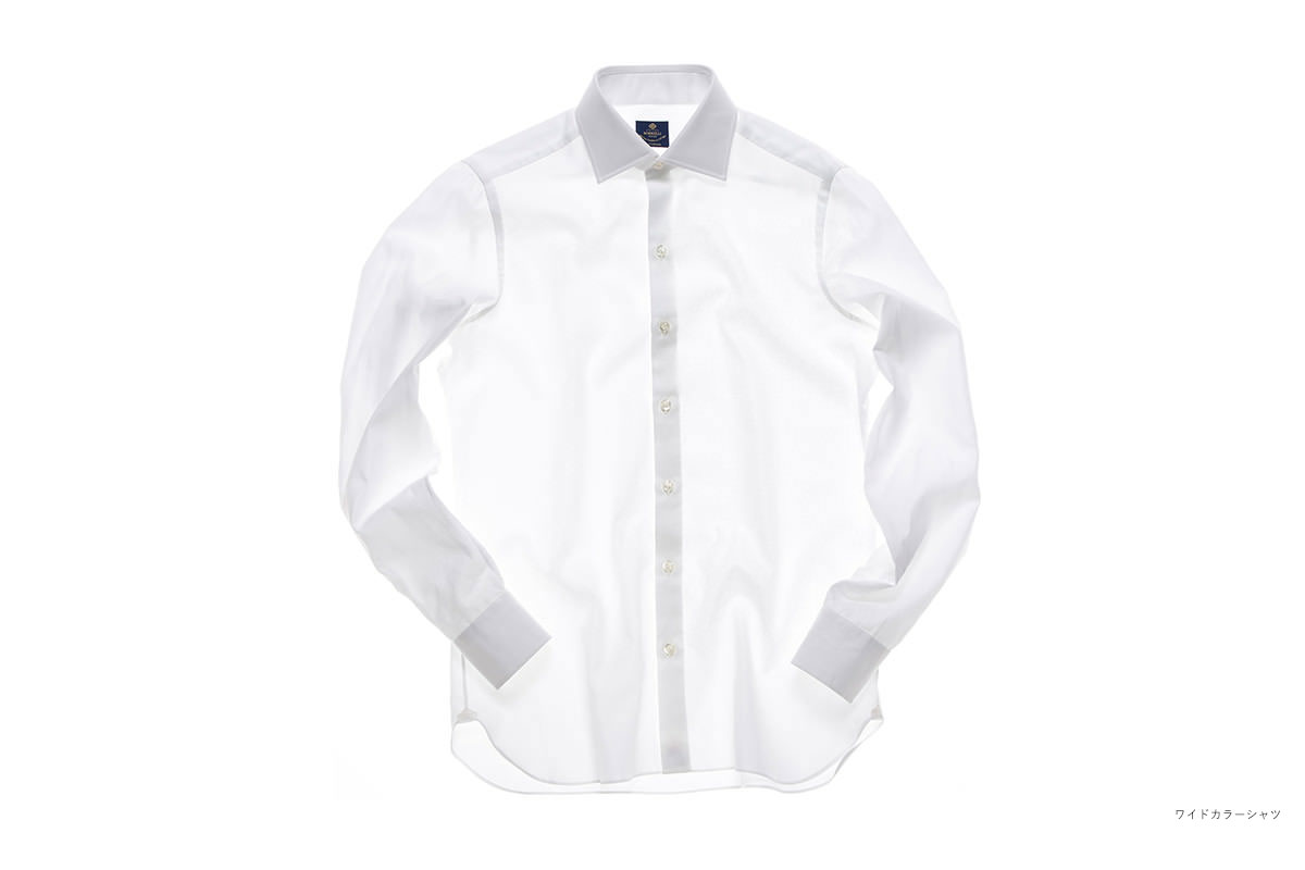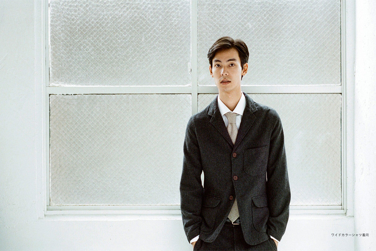 このワイドカラーシャツの素材は「ヘリンボーン」(杉綾)。