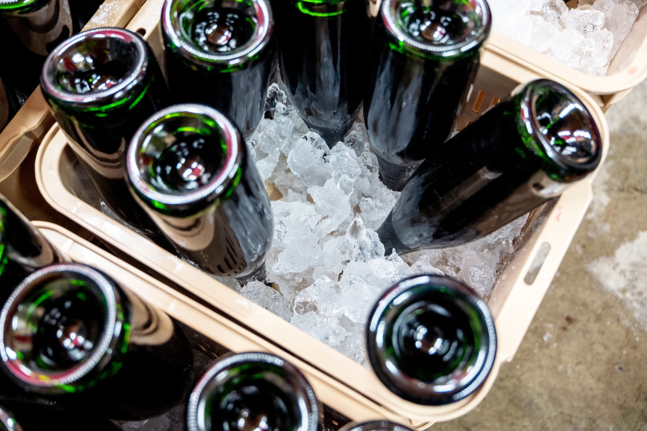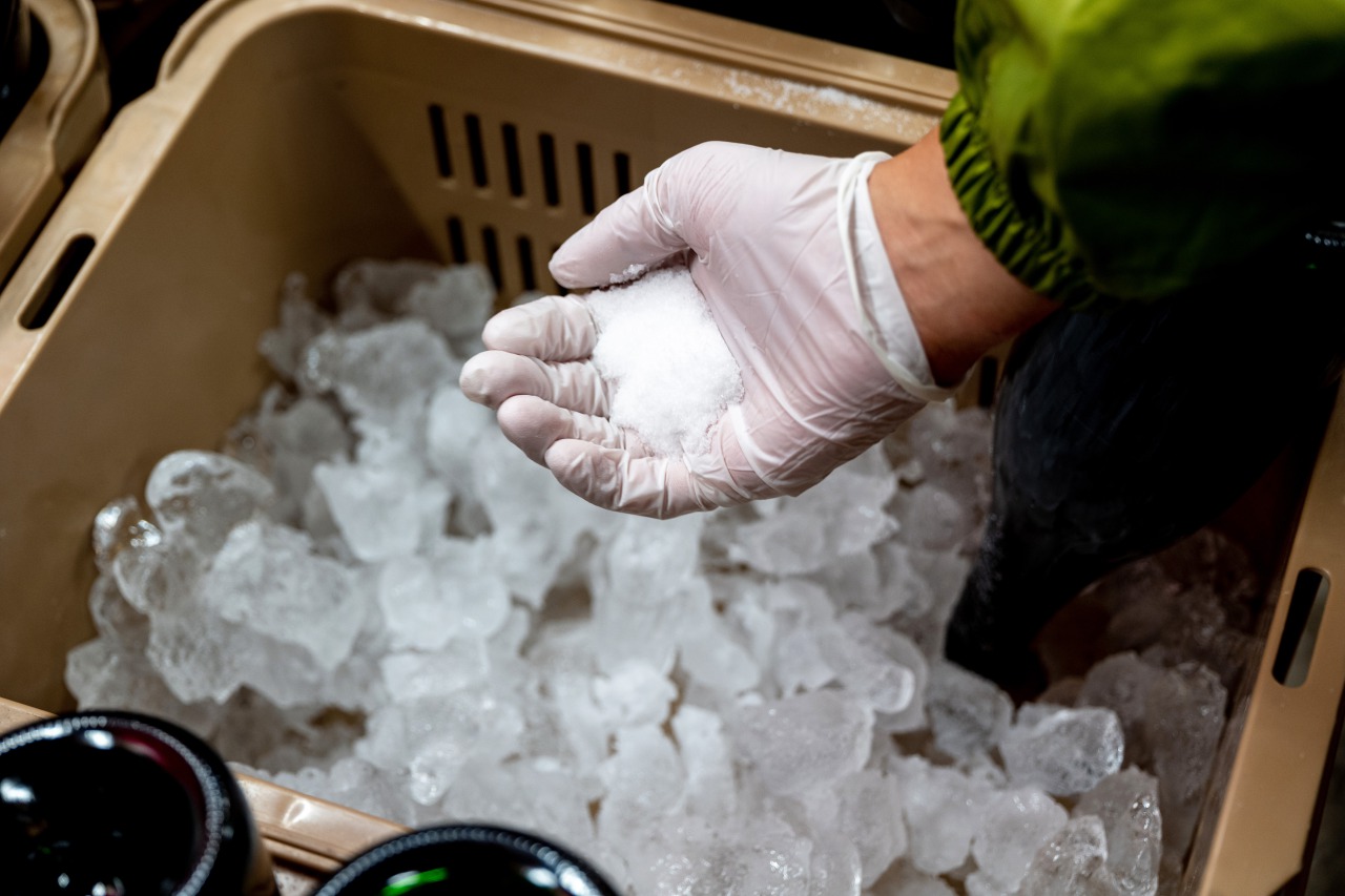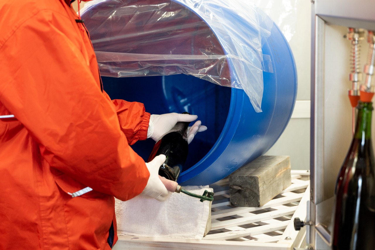 瓶の中で溜まる澱を、凍らせて飛ばす作業です。