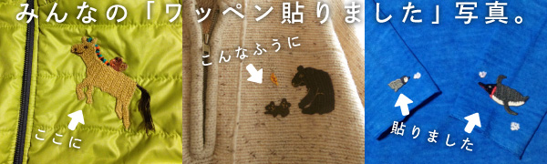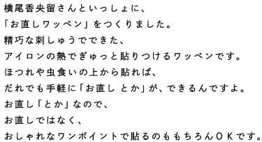 | 「お直しワッペン」は、 横尾香央留さんのオリジナル刺しゅうを できるだけ忠実に再現したワッペンです。 国内の工場に何度も試作をお願いして、 8種類のかわいい自信作ができました。 「アイロン圧着」という手軽な方法で 生地に貼りつけることができます。 |