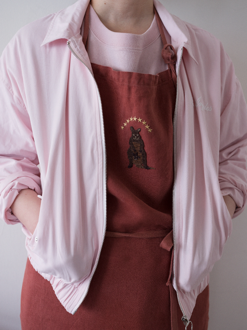 お母さんのポケットから顔を出す