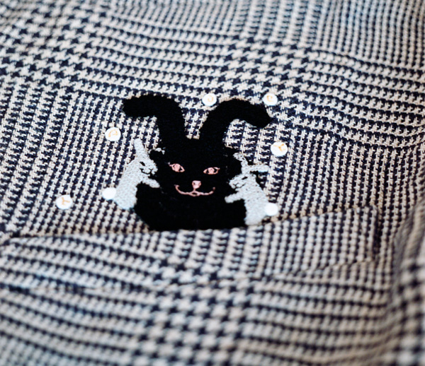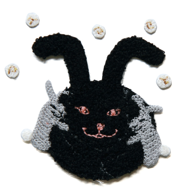 お母さんうさぎにぎゅっとしがみつく、 2匹のこどもうさぎ。 長ーくのびたお母さんの耳は屋根になって、 冷たい雪から子どもたちを守ります。 しずかな物語を感じるワッペンになりました。