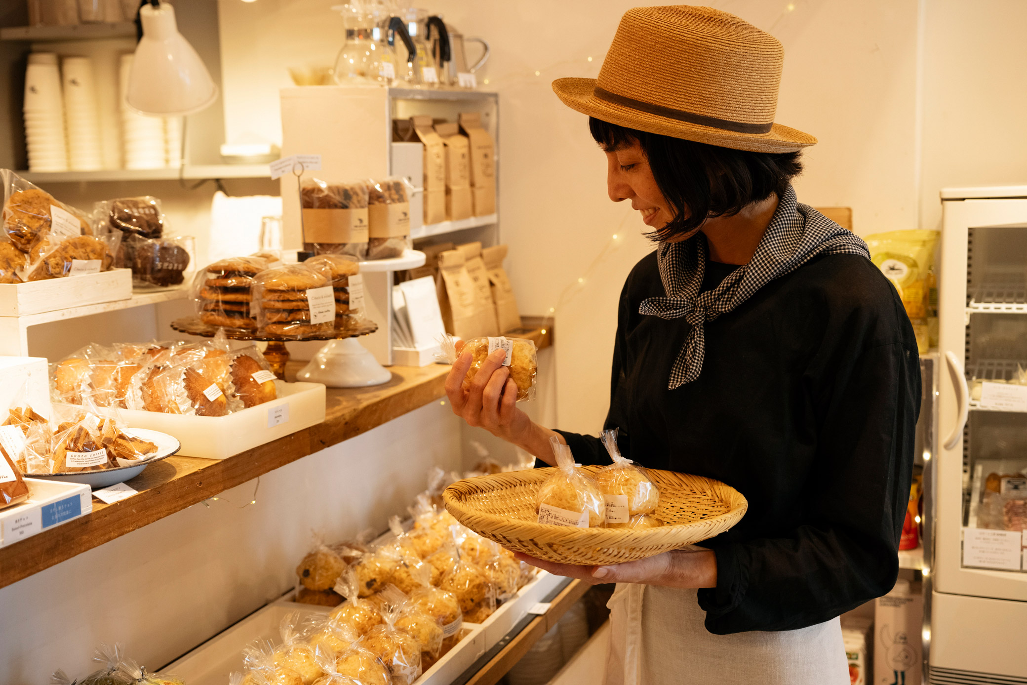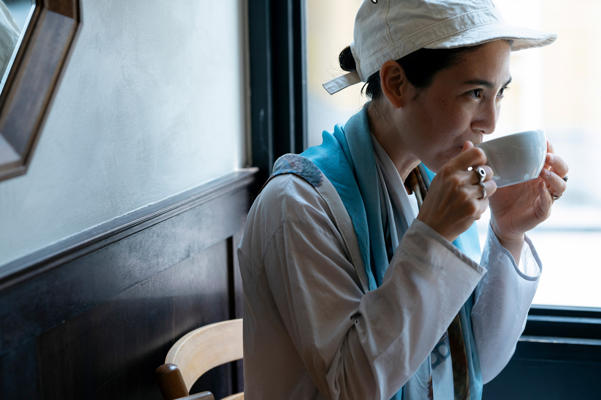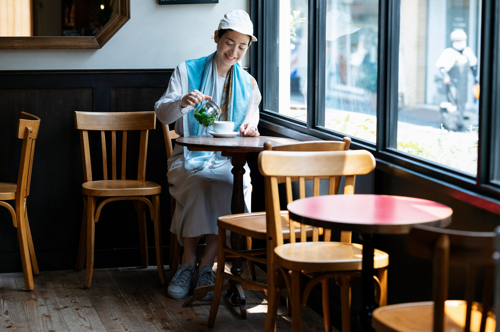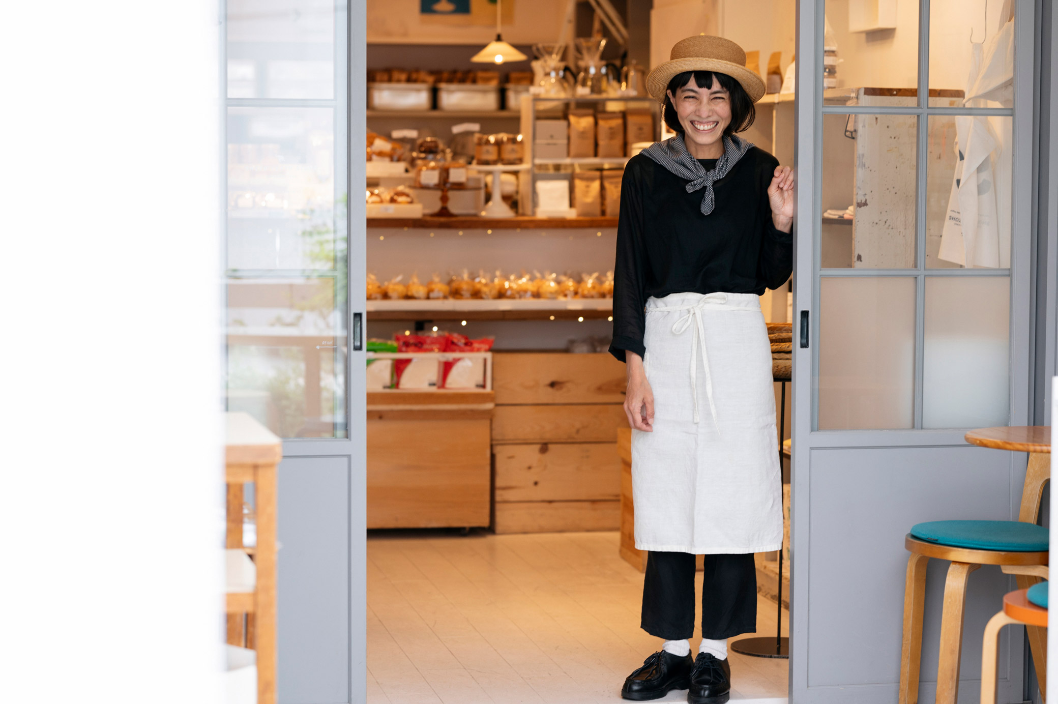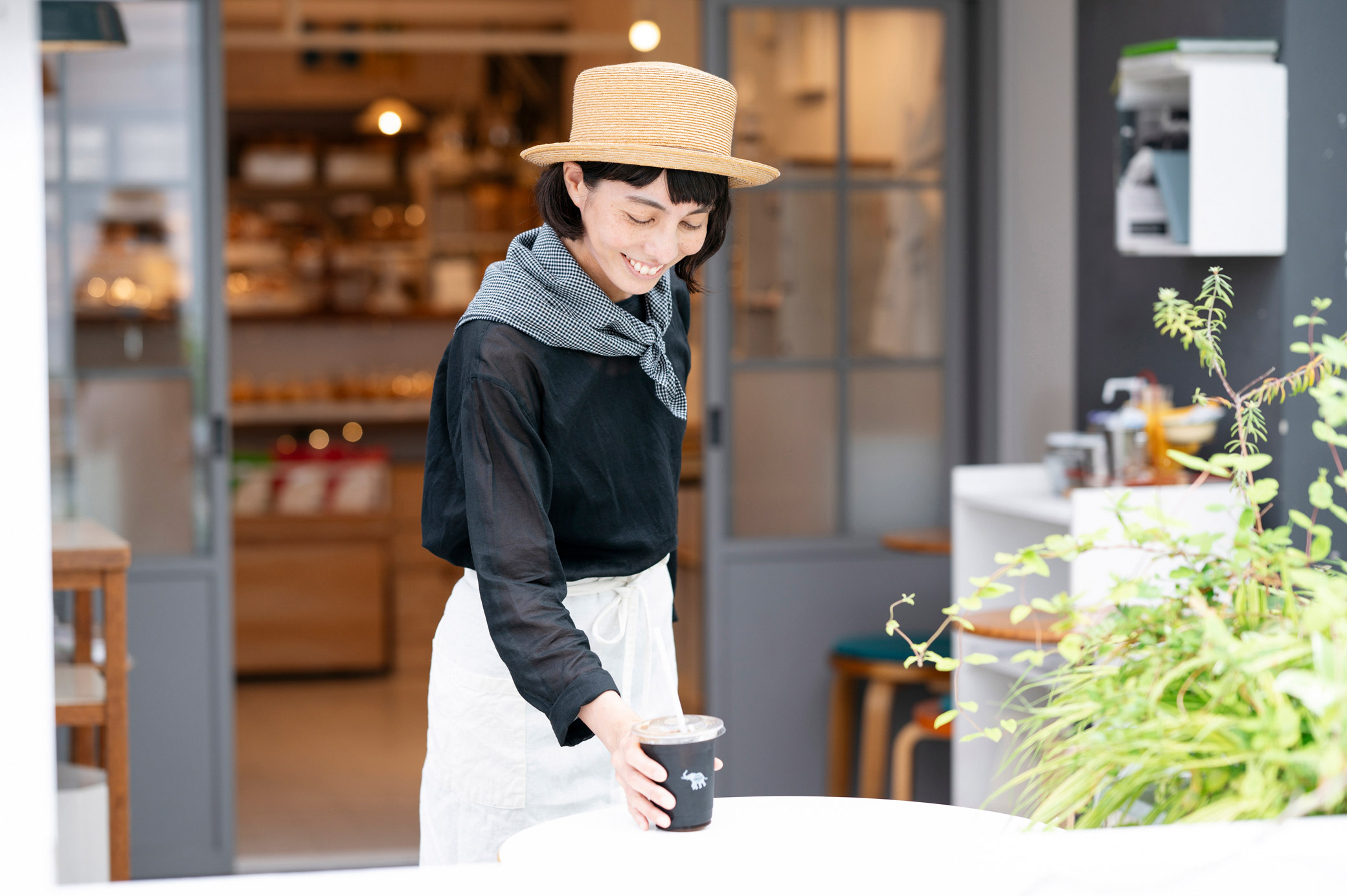 カフェで働く時に着けているエプロンを腰にくるっと。