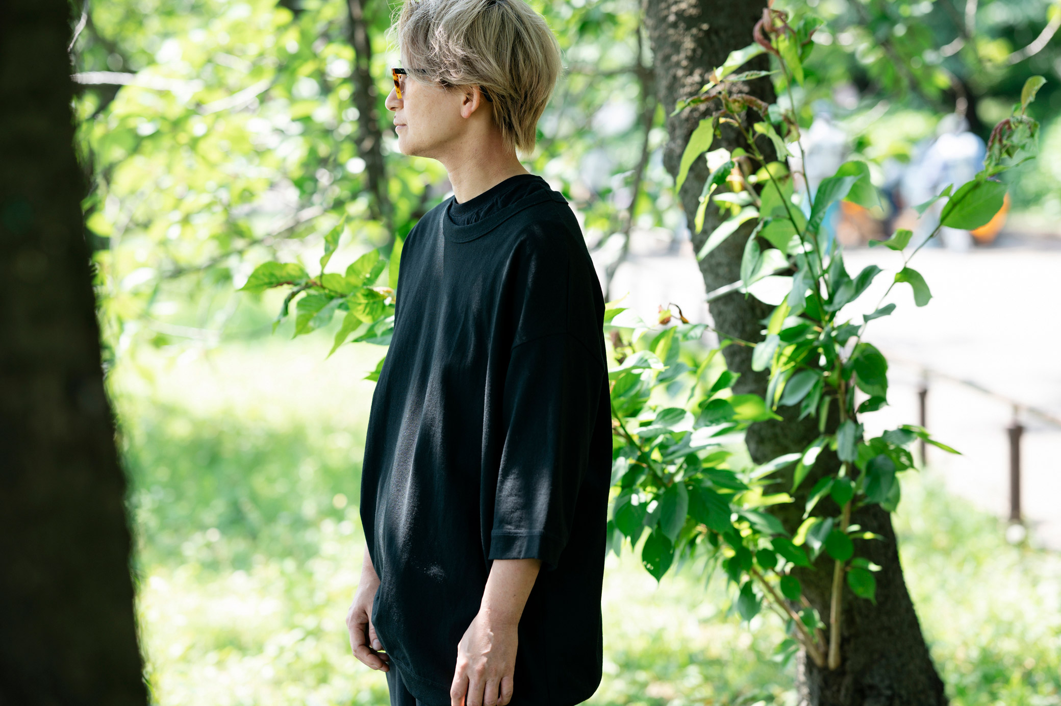 今回は、ブラックのシンプルブラウスとシルクパンツに、