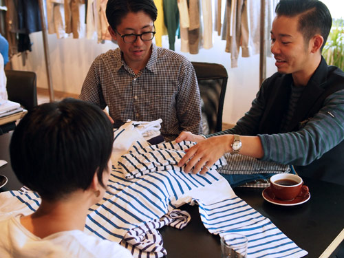 | 江藤 | あ、ごめん、つい見ちゃってた(笑)。 あの、いろんなボーダーシャツを見せていただいて、 ぼくは、シンプルなほうが、しっくりくるなと思いました。 絵とか入ってるのは、まだ手が出せない気がする。 |