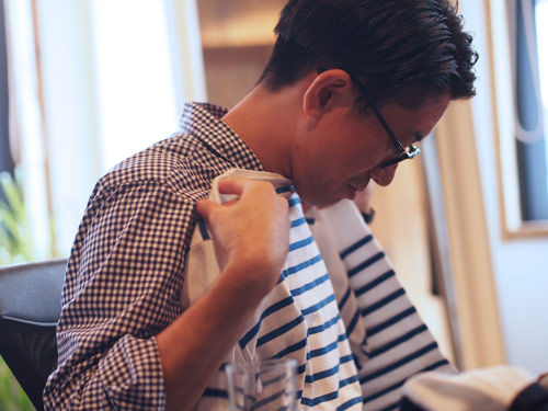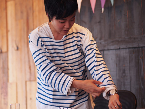 | ほぼ日 | そういえば、 さっき「オーシバル」のボーダーを着たとき、 井伊さんも自然に袖をまくってましたね。 |