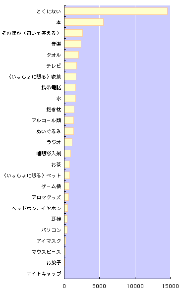 (複数回答)みなさんが眠る直前にすることや、 準備するものです。 これがだいたい決まっているならば、それはあなたにとって、 「眠るための儀式やお守り」といえますね。 一番多かったのは、「とくにない」。 次いで「本を読む」 「そのほか(書いて答える)」 、 「音楽」、「タオル」と続きました。 さらにこの設問では、 「そのほか(書いて答える)」として、 自由にみなさんの「睡眠の友」をあげていただきました。 すると、以下のようなものが多くなっていました。 iPod、DVD、 マスク、靴下、まんが、雑誌、 牛乳、コーヒー、ヨガ、体操、入浴、静けさ、暗闇、 彼氏や彼女、目覚まし時計(セットすると安心できる)、 お気に入りの枕、布団、毛布、タオルケット‥‥。 ご自分の眠りのスタイルと比べて、 いかがですか?