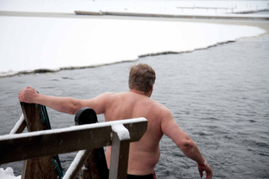 氷点下の空気をすすみ、氷の湖にとびこむ。