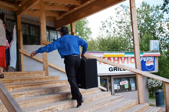 よいしょ、よいしょと、おっきなアンプを運ぶおじさん。