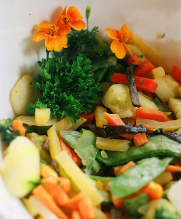 こちらは庭で採れた野菜を温野菜にしたサラダ。