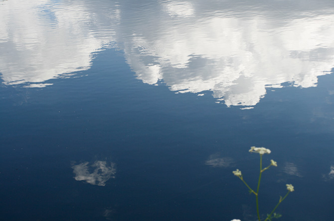 青空と雲が水面にうつる、フィンランドの夏やすみです。