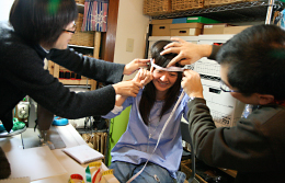 この方法、洋裁としてはちょっと変則的なんです。 でもね、カタチを自由に作っていくには、 なかなかいいやりかたなんですよ。 頭のサイズを測ったら、さっそく工作スタートです!