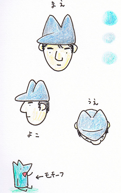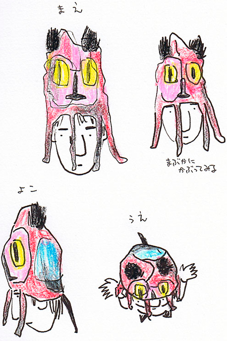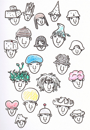 どうぞよろしくお願い致します。 ワクワク悩んでまず思い付いたのは、 普段自分の分身のように描いているキャラクターを モチーフにした帽子です。 ![]() 何かのイベントでかぶったりもできそうだし けっこう実用的に使えるかも! とホクホク。 調子に乗ってイメージでポーズまで取ってみました。 ![]() しかし! ここであらためてスソさんの作品をHPなどで拝見し、 あまりに自由な発想の帽子たちに衝撃を受けたのです。 そしてぼくの迷走が始まります。 ![]() いろいろ考えてみるものの、 どうもいまひとつピンときません。 そこで、発想をひっくり返すことにしました。 はじめに帽子ありきではなく、 自分の絵を帽子としてかぶろうと! かぶることに決めたのは、 去年のほぼ日手帳に何気なく描いた猫の絵です。 実はいまだに、 ちゃんと帽子っぽい最初に考えたやつを つくった方がいいのでは‥‥と 決心がぐらついたりもしてますが、 引っ込みがつかないようにここで宣言しちゃいます。 ぼくは必ず猫の帽子を完成させますニャ!
