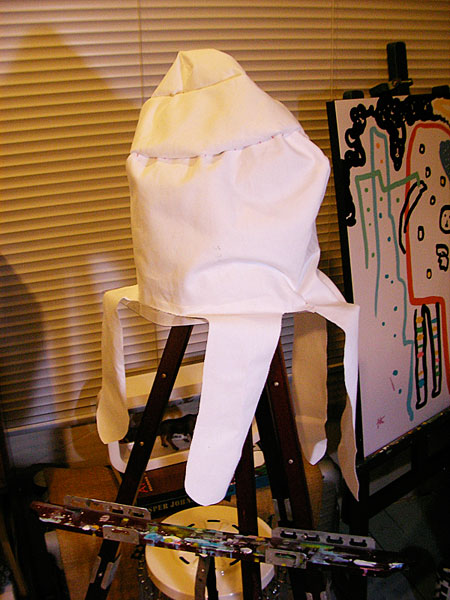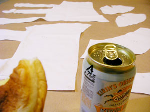 スソ先生のアドバイスが頭の中で カタツムリのジョーの口調に変換されてる、たかしまです。 引き続きよろしくお願い致します。 ついにこのときが来てしまいました。 針と糸を使った縫い物です。 ちゃんとした縫い物って、 たぶん小学校の家庭科の授業以来ですよ。 「では、次回までにスレキのパーツを縫い合わせて (仮)の帽子をつくっておいてくださいね!」と、 にこやか&軽やかに教室から去る先生を見送りながら、 そんな高いハードルをひとりで越えられるだろうかと ぼくは内心おびえていました。 でもひとりじゃなかった。 そんなぼくの不安を察して「切腹帽子」のモギさんが 教室後に針と糸の使い方をレクチャーしてくれたんです。 ありがとうございます! がんばってみます!! 深夜2時、 自宅アトリエの床一面にスレキのパーツを並べ クリームパンとビールでエネルギーを補給したら、 おっかなびっくり作業開始です。 ![]() パーツの合い印どうしを待ち針で止めておいて、 例の7mm線に沿って縫って行きます。 チクチクチク…。 待ち針がポロポロ抜け落ちますが気にしません。 チクチクチク…。 針がしばしば指に刺さって痛いのは ちょっと気になりますが、 チクチクチク…。 糸がすぐこんがらがってイラッと来ますが、 チクチクチク…。 で、できた! 帽子のてっぺん部分ができたー!! ![]() 縫い物、いけるかもしれません。 残ってたビールを飲み干して、 出て来た勢いにまかせて チクチク、チクチクと縫っていきます。 最初はビローンと伸びちゃったり 変な輪っかができちゃったりしてたタマ止めが わりと上手にできるようになった頃、 ついにできあがりました。 真っ白けの(仮)ではありますが、 布製の猫の帽子が! ![]() 正直、縫い目はひどいものですが、 たまらなく愛おしく感じます。 (仮)でこんなに感激してるんだから、 本物が完成したらどうなっちゃうんでしょうね。