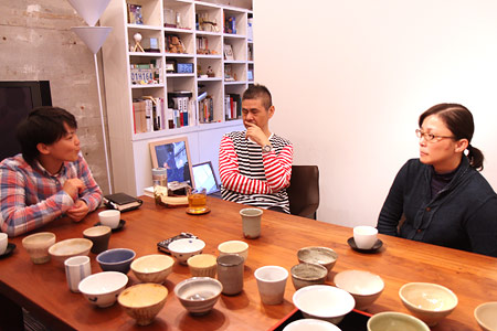 | 道歩さん | 兄弟子です。 円(まどか)の 弟弟子(おとうとでし)になりますね。 なぜ護光さんに声をかけさせていただいたかというと、 もちろんご本人の作品がすばらしいということも あるんですけれど、 私が本当に現代の作家さんといわれる人のものを 知らなかったということが、あるんです。 やっぱり家(土楽)のものばっかり見てたもんで、 護光さんに「誰かご存知ないですか」 っていうふうに聞きました。 そしたら、こういう人がいるって、 いろんな人、教えてくれはったんですよ。 |