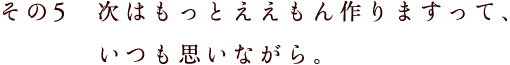 もっといいものができるはずって。 今度作るときはもっとよくなるはず、 もっと、もっと。 いつもそれの繰り返しで それは私らも教えてもろうて 守ってるつもりでやってます。 もっと、次はもっとええもん作りますって いつも思いながら。 |