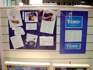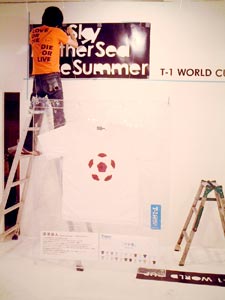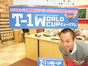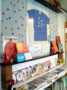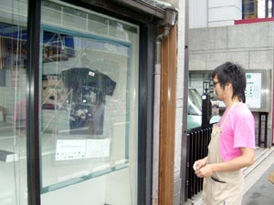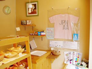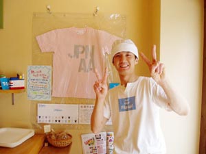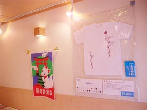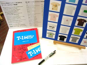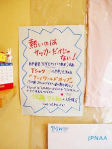 関西エリアの、 パワフルなレポートをお届けします。 関西エリアには、 京都府、大阪府に4ミュージアム、 奈良県、和歌山県(2店舗合同)、 兵庫県にそれぞれ1ミュージアムと、 全部で11箇所の展示が開催されています。 薬局や額縁屋さん、 イベントホール、カフェにパン屋さん、 など、バラエティに富んだ関西地区。 本日は、そんな関西地区のミュージアムを、 ご紹介致します。 アイデアたっぷりの展示方法にも、 ご注目くださいね! ※展示場所の期間や場所などの詳細については、 このページの下の方にあります展示場所一覧で、 チェックしてくださいね。 「サイラス」のTシャツが届きました。 閉店後に展示に取り掛かったので、 終わった頃には、すっかり真っ暗になりました。 私の勤めているお店は、京都のど真ん中! 四条通に面している、 藤井大丸の横に通っているのが、寺町です。 その道をずぅぅ〜っと、下がってもらったらあります。 高辻通の手前にあり、お向かいは、お寺さんです。 (京都人は、南に行くことを「下がる」と言います。) 飾った所の全体写真です。 丁度良い枠があったので、使ってみました。 判りにくいかも知れませんが、 バックに麻ヒモを利用しています。 ![]() サイラスさんのインタビューを飾ってみました。 ![]() Tシャツを見るアルバイトの林君です。 ちなみに彼は、 日本画家として京都で活動されています。 ![]() サイラスさんに、 飾り方は気に入っていただけるかなあ? 喜んでくれはったら、幸いです。 (京都府京都市 フレームショップ巧 会場案内) 展示場所は、家族でやっている店で、 ちりめん山椒を作って、売っています。 お店の場所は、伏見稲荷大社の前で、 最近、伏見稲荷は日本人観光客ばかりでなく、 海外の方も見かけるようになりました。 店内に飾ったところ、ご近所の方がやって来て 「なんぼ売ったらいいねん? (どれだけ枚数売ったら良いの?)」 「いや、展示だけで良いみたいで‥‥」 「ふう〜ん‥‥」 という、やりとりが早速ありました。 ぜひ、見に来てくださいね。 ![]() (京都府京都市 ちりめん山椒庵 会場案内) エリック・シュピーカーマンさんの Tシャツを飾っている、 PHARMACY UTANOこと宇多野薬局です。 ![]() 展示場所は、 西は広沢の池、大沢の池、東に仁和寺、 竜安寺、金閣寺など、 観光名所も近いのでぜひお立ち寄りください。 声をかけてくだされば、ありがたいです。 ところで、面白そうと思い応募を決めましたが、 その写真をどうして送るの? と、 インターネット初心者が集まって、 なんとか応募した次第です。 ミュージアムに選ばれたとき、 えらいことになったとおおあわて! 私たちのできる限り、 盛り上げていこうと思っていますので、 よろしくお願いします。 館員さんたち、 なかなかゆうこと聞いてくれず、 写真も大変でした。 ![]() この3人さんも、応援してます。 ご来館まっています。 (京都府京都市 PHARMACY UTANO 会場案内) 京都のFlip up! は、 オフィス街から少しだけ離れた、 町屋が並ぶ場所にあるぱん屋です。 京都らしい町並みをこわさぬよう 外観もちょっと古風で、 お店には暖簾をくぐり引き戸を開けて入ります。 レジのすぐ横に、Tシャツを飾ってみました。 店内の雰囲気が(イイ意味で) 一気に変わった気がしますが、 とってもイイ感じに納まってます。 ![]() Tシャツの横に貼ってある紙の拡大画像です。 ![]() 「Flip up!は、日本代表 佐藤可士和氏を応援!!」 店長の力作です! 突然展示されたTシャツを、 不思議そうに眺めていくお客様のために 手書きの説明を付けてみました。 Tシャツ好き店長も大喜びの図です。 ![]() 「このTシャツが優勝するんじゃないかな〜」 と、予想してるようです。 ちなみにお店のユニホームも、 Flip up! オリジナルTシャツです。 (偶然ですが、胸元のデザインが T-1のポストカードに似ています。) わかりにくいですが、外から見た感じです。 ![]() ガラス張りのお店なので、 通りすがりでも目に入ると思います。 眺めに来ていただくだけでもよいので、 お近くの方がいらっしゃいましたら ぜひ見に来てください! 私も記念に携帯カメラで撮ったのですが、 ソレを友達に見せたら、 「JAPANとPAN(パン)がかかってるのかな?」 と、言ってました。 ナルホド(笑)。 (京都府京都市 Flip up! 会場案内) 壁も床も天井も真っ白なギャラリーです。 オープンからまだ1年と月日の浅いギャラリーですが、 写真に絵に版画、立体造形、映像と音楽など、 様々な枠を超えて、面白いモノ・素敵なモノを 発信出来れば思っています。 今回の募集を見て、 素敵なTシャツが、この真っ白な空間に ポンとひとつだけ真ん中に吊るされていたら 面白いだろうなぁと思い、応募させていただきました。 Tシャツが届いたので、早速、 Tシャツを広いギャラリーの真ん中に吊し、 浮いているように演出。 ![]() ![]() ![]() 観に来ていただいたお客さんに、 仮想試着をしていただきます!! そして記念にパチリ。 ![]() 新しい素敵な繋がりが生