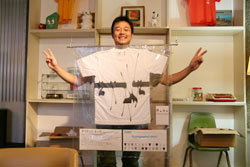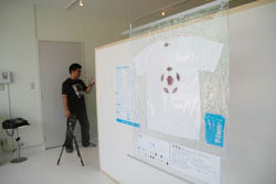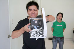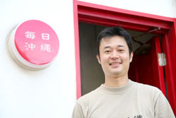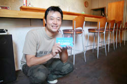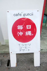 7月4日 火曜日 T-1 JAPAN TOURファイナル。 そして「例の企画」が明らかに。 「T-1ミュージアム JAPAN TOUR(西本編)」 ファイナルとなる4日目、7月3日月曜日。 沖縄から福岡、そしていよいよ、 四国の「とある島」に入った西本の、 レポートを本日はお届けいたしますね。 さらに関東班から、 新着のミュージアムレポートもご紹介します! 神奈川県鎌倉市の「和温waonスタジオ」さんです。 ![]() 「鎌倉にある和音waonスタジオに展示されています、 祖父江さんのTシャツをみてきましたー! とても静かなのんびりした屋外を フィヨ館長さん(写真左)が 元気いっぱい走り回っていました。 お礼に、10TARO贈呈してきました!」 (ほぼ日乗組員・南郷) そして、別途、東京から、 その「とある島」での打ち合せのため、 四国に訪れたT-1チームの私(杉江)と中林も、 まずは、徳島県阿波市にあるT-1ミュージアム、 「土柱パラダイス」へ行ってきましたよ。 ところで、「土柱」ってご存知ですか? 恥ずかしながら、「どちゅう」と読むことも 知らなかったわたしたちは、 館長さんに案内され、 その「土柱」を見に行きました。 ![]() この写真は、館長さんが送ってくださった 「土柱」の写真です。 「土柱」とは、 約130万年前の地層が風雨に侵食されてできた 断崖絶壁、つまり土の柱のことだそうです。 聞いて驚いたのは、 イタリアのチロル地方と、 アメリカのロッキー山脈と、 日本の徳島県阿波市でしか見られない、 つまり世界に3箇所しかないものなんだそうです! (テキスト中継では情報が間違っていてごめんなさい。) でも、実際には侵食が進み、10年前と比べると、 かなり景観が変わってしまったとか。 早いスピードで侵食が進んでいるので、 ぜひ今のうちに見に来て欲しいと、 館長さんからのメッセージでした。 ![]() 夜にはライトアップもされているそうなので、 ぜひドライブがてら見に行ってみてくださいね! 土柱パラダイスの館長さんに、 感謝の気持ちを伝え別れたあと、 われわれT-1チームは、 「とある島」に向かい、西本と合流。 これで「T-1 JAPAN TOUR」は終了!! ‥‥のはずでしたが‥‥。 さて、続きは西本のレポートでご覧くださいね。 そして西本のレポートで、「とある島」の 「例の企画」の真相は分かるのか?! いつまでひっぱればいいのか、 もはや私にはわかりませんが、 とにもかくにも全力疾走の西本レポートを、 本日もお楽しみください。 ※展示場所の期間や場所などの詳細については、 このページの下の方にあります展示場所一覧で、 チェックしてくださいね。 <T-1 JAPAN TOUR4日目はこうだった!レポート> 金、土、日、月と4日間をかけて 北海道から沖縄までかけぬけた T-1ミュージアム JAPAN TOUR。 総移動距離は…、えっと…。 …すみません。 計算できません。 とにかく終了しました。 今は香川県の直島にある 海辺のパオに 男一匹4人部屋に宿泊中。 ![]() 日本全国に散らばった T-1ミュージアムのTシャツが 9月にこの直島に集まり すべてのTシャツを展示するミュージアムを ここ直島で展開する予定です。 最終日の昨日は 沖縄→福岡→岡山→直島という移動。 初めての沖縄を 満喫したいところでしたが お昼すぎには沖縄を出ないと その日のうちに直島入りが できない可能性があったので ホテル近くのレンタカー屋を開店前に訪ね、 開店直後の朝8時に出発。 これ以上詰めようがないスケジュールで 那覇を出て沖縄市に向かいました。 一つ目にうかがったミュージアムは 沖縄市宮里にある 「毎日沖縄毎沖カフェ」さん。 ![]() この看板が目印です。 普段はお昼から開店するにもかかわらず 早い時間からお店で待ってくれていたのは 館長の大屋さん。 ![]() このミュージアムには ここにきてランキングが急上昇中、 イスラエル「オーデット・エーザ」さんの Tシャツが展示されています。 ![]() T-1ポスターの飾ってある入り口から 地下に降りていく吹き抜けのフロアに ![]() 存在感のあるTシャツが展示されてましたよ! Tシャツの展示には 「壁貼付け派」と「宙づり派」の二つの 流派がありますが こちらは「宙づり派」。 ![]() バックプリントもチェックできる上に ![]() こうやってTシャツの疑似試着が楽しめます。 ![]() 「8131」は沖縄方言の「ハイサイ」。 こちらはオーデット・エーザさんが 作ったタイポグラフィックソフトで タイプされたもの。 ![]() 今回のメインの仕事である チラシとステッカーの補充も完了。 お話をうかがっていると 大屋さんの奥さんもやってきましたよ。 ![]() 大屋さんの奥さんは 沖縄で唯一の動物園におつとめなのですが 「今日、このTシャツを 動物園にもっていって お客さんに感想をもらってきます。 ほぼ日にもレポートを送るので 楽しみにしててくださいね」 ![]() 夫妻でT-1を応援してくれてうれしいっす。 最後に大屋さんも着ている 「毎日沖縄Tシャツ」をぼくもきて 3人で記念撮影をしてお別れ。 ![]() 本当は昼ご飯も食べていきたかったなあと 思いながら高速に飛び乗って 「南風原