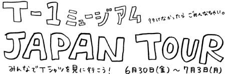 というやりとりが 本当にあったかどうかは別として、 『例の企画』についても謎のままではありますが 6月30日(金)から7月3日(月)まで 「T-1スタッフ」たちが 「T-1チラシ」と「T-1ステッカー」を携えて 国内それぞれのミュージアムに補充に参ります。 この模様は「ほぼ日」誌上でも 極力リアルタイムでお知らせしていきますよ。 今週末はあなたの家の近くにある 「T-1ミュージアム」でお会いしましょう! |