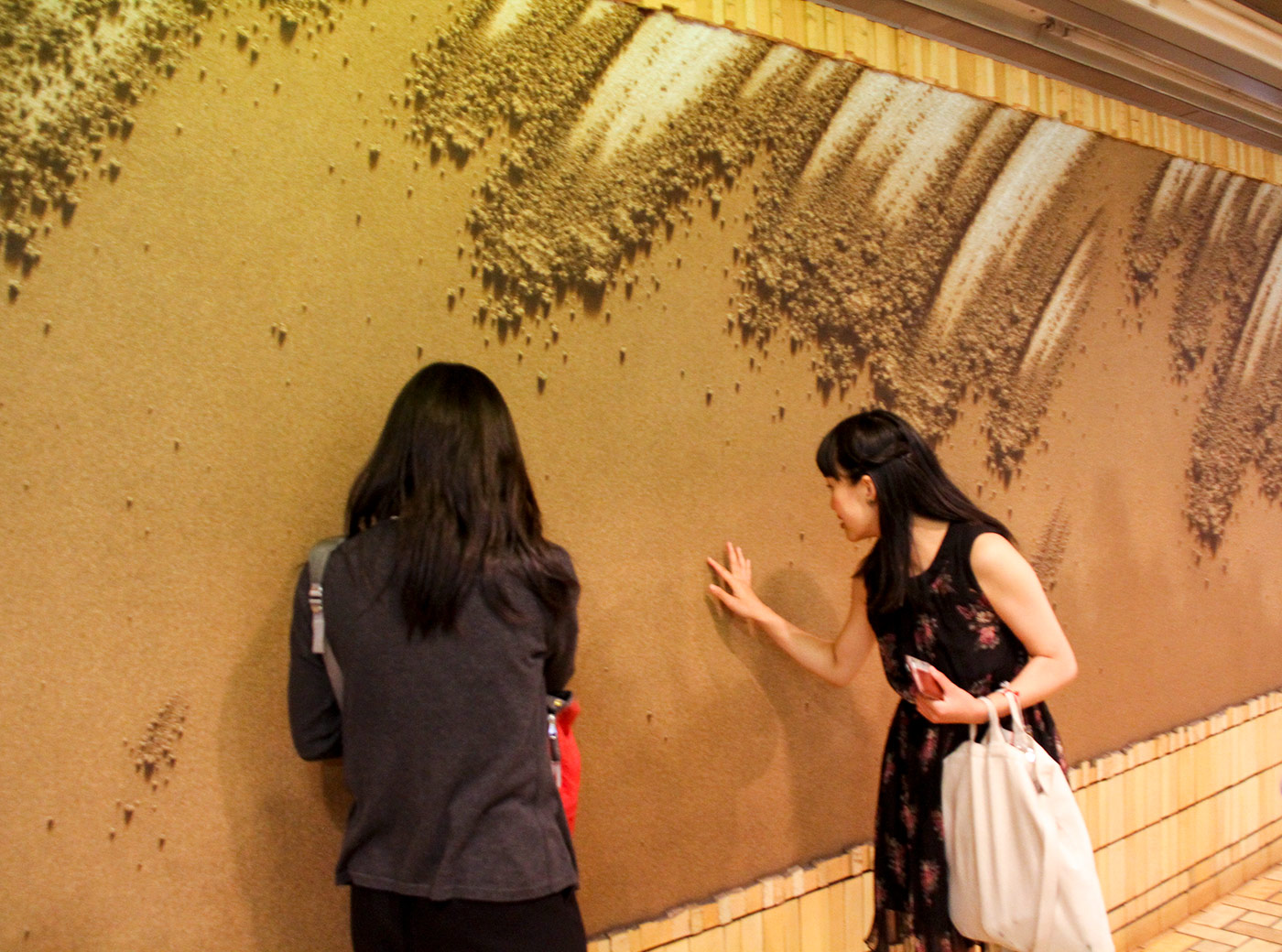 階段を降りると、なぜか駅の壁がサンドアート風!