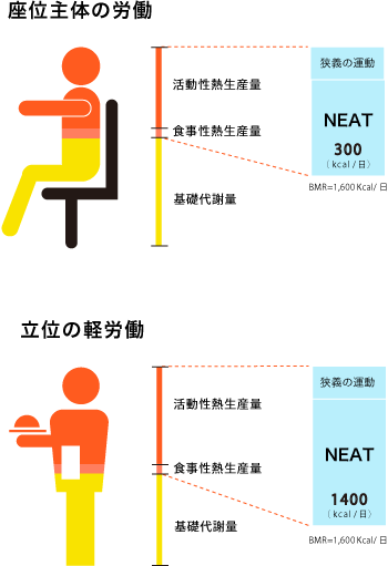 | 高橋 | たとえば、 職種として日常的に立っていることが多い人は 座りっぱなしの人よりも、 エネルギーの消費量が多くなります。 具体的に言うと、「立ってする軽労働」の場合、 NEAT部分の一日のエネルギー消費量は、 1400キロカロリーほど。 もちろん、その他にも 基礎代謝で1000キロカロリー以上は必要ですが。 |