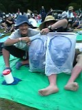 ちょっとずつ充電しながら中継を続行しますよ。「Be TAROですか。太郎になれ!っていわれても僕、太郎って名前なんです」Oh、また太郎さん(向かって右のかたです)に会っちゃいました。ゴミ袋にはゴミを入れず、バッグとして使っていらっしゃいました。ライブをたのしんでくださいね〜。