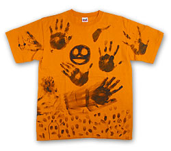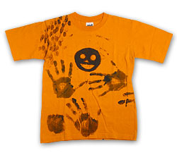 それからしばらく、 机の上に2枚のオレンジを並べて ふたたび考え込んでいたYO-KINGさん。 Tシャツの上に置いた手が なんだか印象的でした。 そして できあがったTシャツが こ・ち・ら・です! ●YO-KINGさんからのメッセージ 勢いを大切に楽しくやりました。 ●購入してくださる方へのメッセージ 隠れキャラを探してください。 隠れキャラ‥‥‥ いいい、いますいますいらっしゃいます! YO-KINGさんの手形が力士ばりに バーン、バーン、しています。 みなさん、ラフォーレ原宿へ 実際にみにきてくださいね。 web抽選販売の受付開始も、迫りつつありますよ! では、また次回!
