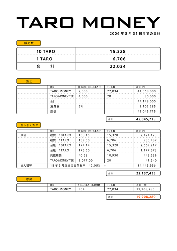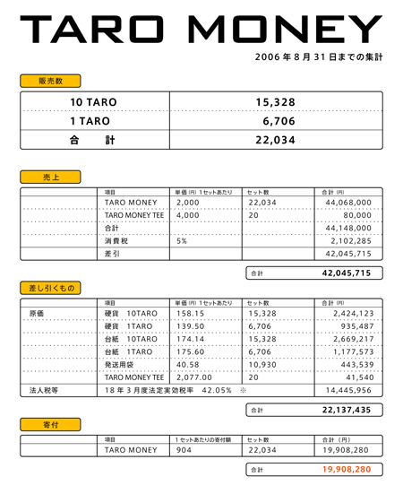 「手にしたTARO MONEYの原価」「寄付」「税金」